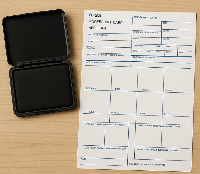 For any background check, licensing, or clearance process that requires traditional ink-and-roll fingerprint cards, we provide professional capture. We supply the card (FD-258 or equivalent), proper ink pad, roll each finger, ensure high quality prints, and deliver the card to you or directly submit as required.