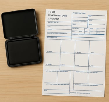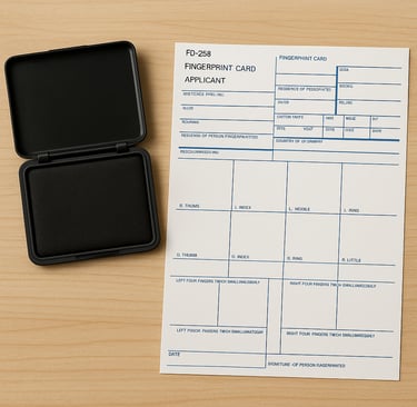For any background check, licensing, or clearance process that requires traditional ink-and-roll fingerprint cards, we provide professional capture. We supply the card (FD-258 or equivalent), proper ink pad, roll each finger, ensure high quality prints, and deliver the card to you or directly submit as required.